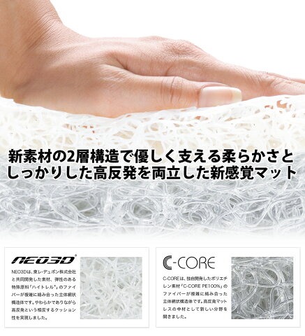 快適な座り心地で好評な高反発素材「C-CORE」と、柔らかく高反発な新素材「NEO3D®」を組み合わせたハイブリッド構造で、「高反発でも柔かい」絶妙なクッション性を実現した新感覚のマットです。
